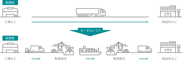 トラックなどの自動車で行われている貨物輸送を環境負荷の小さい船舶などの利用へと転換することをいいます。
